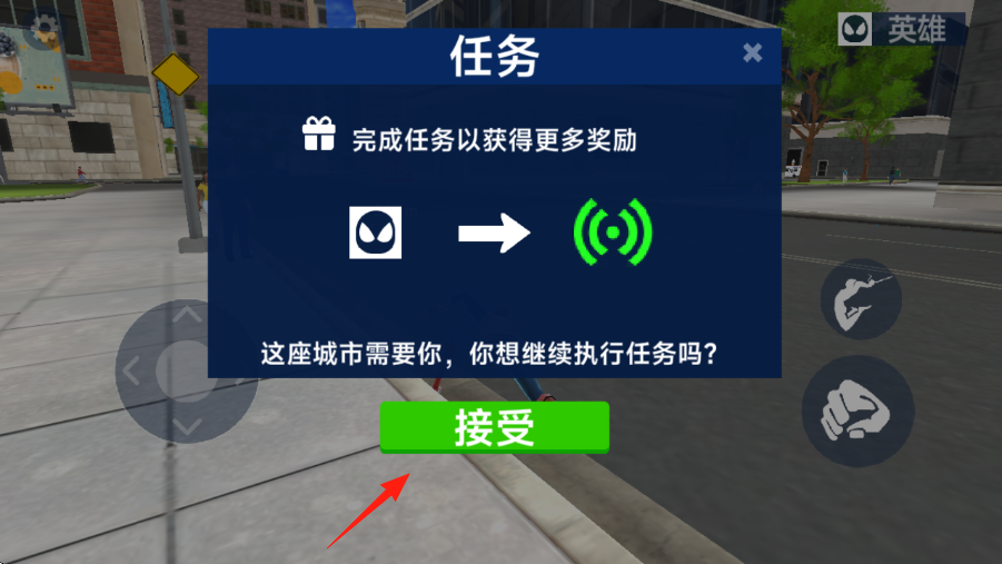 1、進(jìn)入游戲后,在任務(wù)界面,點(diǎn)擊箭頭指的接受按鈕,承接城市任務(wù),開啟保衛(wèi)行動(dòng)。