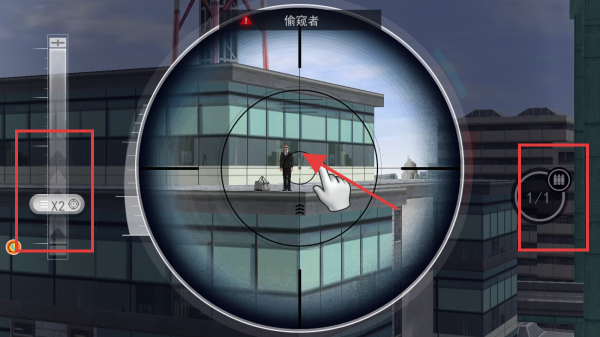 3、在狙擊游戲場(chǎng)景中,利用左側(cè)的倍率調(diào)整按鈕和右側(cè)的射擊按鈕,瞄準(zhǔn)紅色箭頭所指的目標(biāo),完成狙擊任務(wù)。