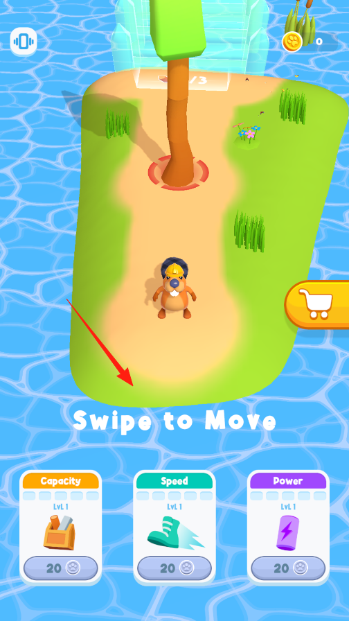 1、在松鼠建筑師初始界面,滑動屏幕,控制海貍移動,通過滑動操作,讓海貍在島嶼上探索,準備開展伐木等任務(wù),體驗基礎(chǔ)移動機制。