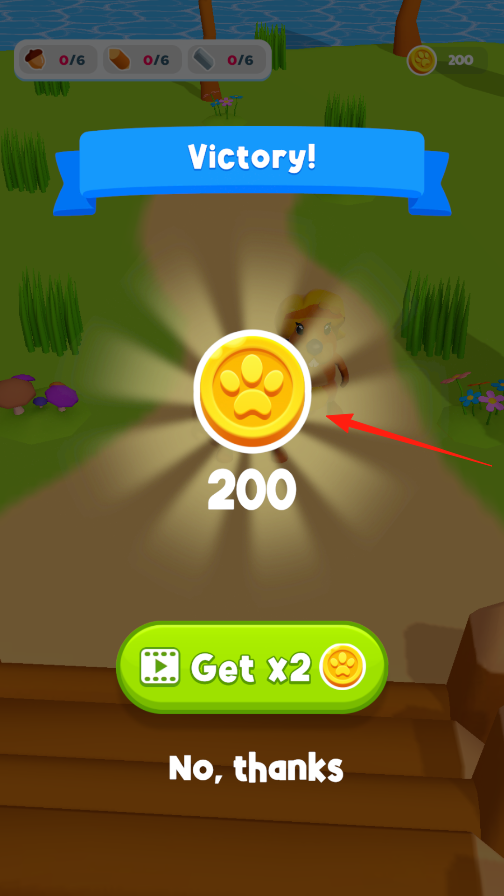 3、完成關(guān)卡后,界面顯示Victory獲得200金幣獎勵,點擊Getx2可加倍金幣,或選No,thanks直接領(lǐng)取,用于升級海貍屬性,體驗獎勵結(jié)算機制。