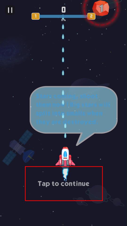 1、點(diǎn)擊Tap to continue開(kāi)啟游戲,操控火箭進(jìn)入太空?qǐng)鼍?,?zhǔn)備應(yīng)對(duì)下落星星,開(kāi)啟射擊挑戰(zhàn)。