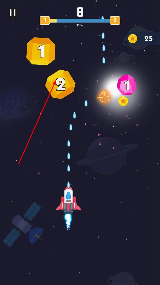 2、點(diǎn)擊屏幕射擊,優(yōu)先擊破帶數(shù)字星星,大星摧毀后分裂小星,同時(shí)收集金幣,躲避或擊破障礙。