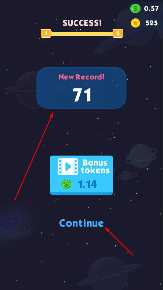 3、成功通關(guān)后,界面顯示新紀(jì)錄與獎(jiǎng)勵(lì),點(diǎn)擊Continue進(jìn)入下一輪,挑戰(zhàn)更高分?jǐn)?shù),解鎖更多關(guān)卡與火箭升級(jí)。