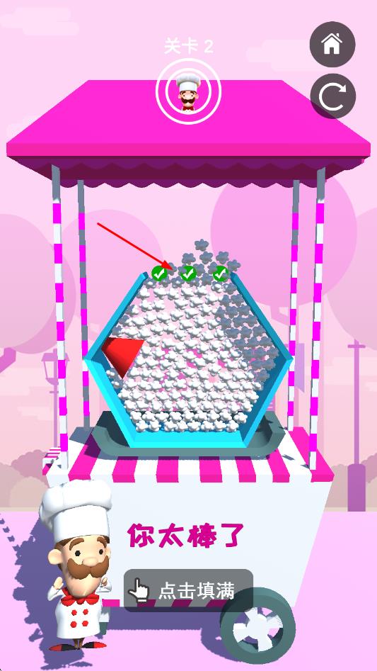 3、將爆好的爆米花裝入指定包裝盒,根據(jù)完成速度和完整度獲得評價,解鎖新容器和口味,繼續(xù)體驗制作樂趣。