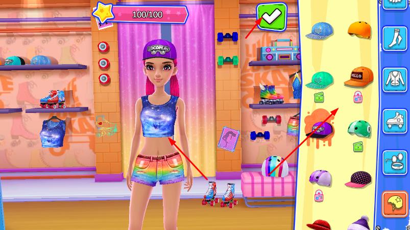 2、在衣帽間里,屏幕右側(cè)有各類服裝、配飾圖標(biāo),點(diǎn)擊衣物、帽子、鞋子等,為輪滑女孩進(jìn)行裝扮,完成搭配后,點(diǎn)擊綠色對(duì)勾按鈕確認(rèn)裝扮。