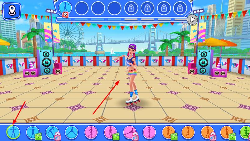 3、離開衣帽間,前往比賽場地,點(diǎn)擊屏幕下方的不同動(dòng)作按鈕,控制輪滑女孩做出各種輪滑動(dòng)作和技巧,展示輪滑技術(shù),在賽場上盡情展現(xiàn)風(fēng)采,贏得觀眾的認(rèn)可。