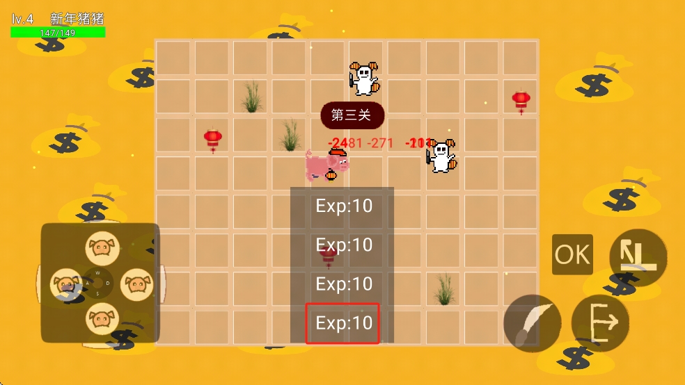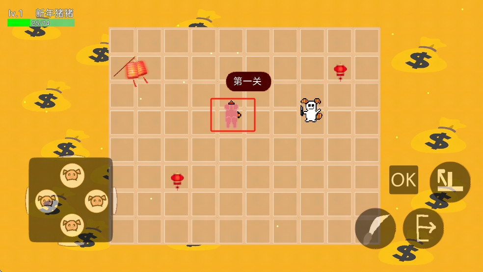 1、在第一關(guān)界面,操控新年豬豬角色,利用左側(cè)按鍵移動,靠近敵人前,規(guī)劃路徑,借助場景燈籠等標(biāo)識,準(zhǔn)備進(jìn)入戰(zhàn)斗。