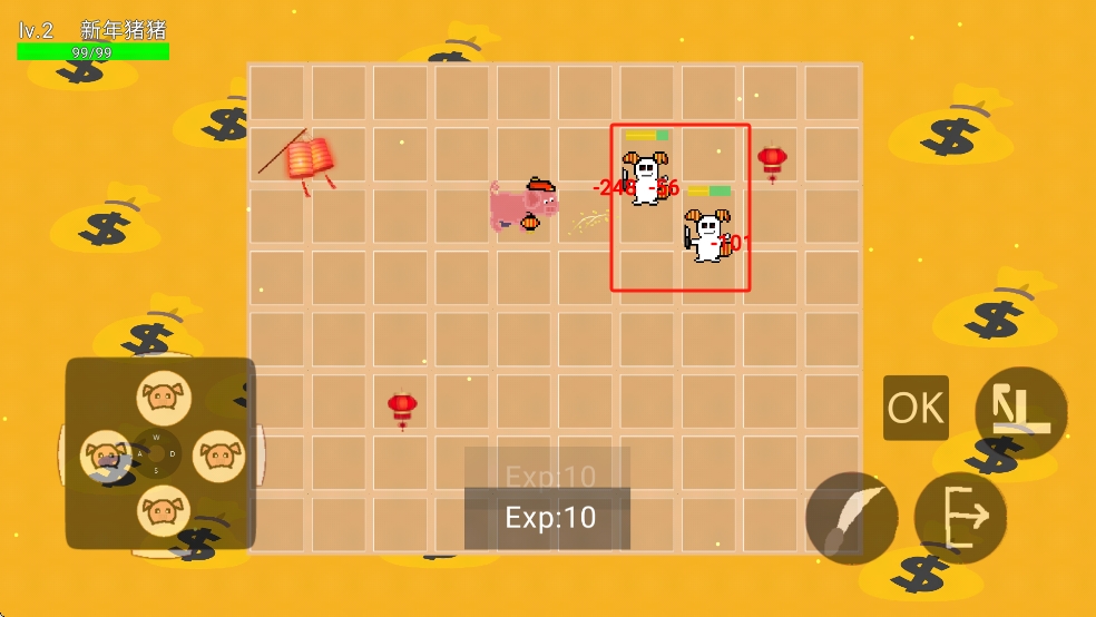 1、基礎(chǔ)打怪戰(zhàn)斗:點(diǎn)擊屏幕控制豬豬向怪物發(fā)起攻擊,長按蓄力可釋放重?fù)簦鎸Χ鄠€怪物時,優(yōu)先攻擊血量少的敵人,減少被圍攻的風(fēng)險,穩(wěn)步推進(jìn)戰(zhàn)斗。