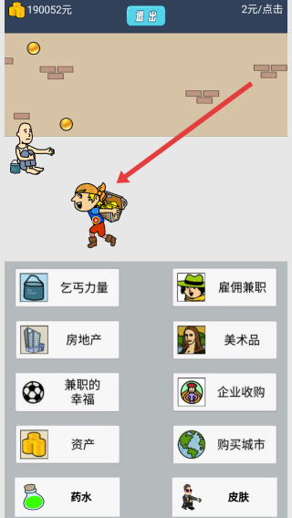 2、在主場景中,有角色走過時,通過點擊屏幕任意位置手機金幣,積累資金用于后續(xù)投資。