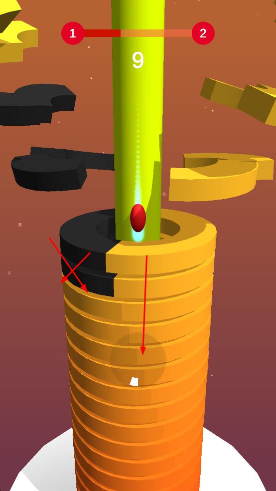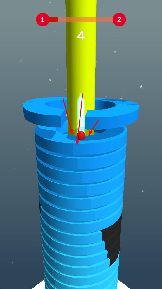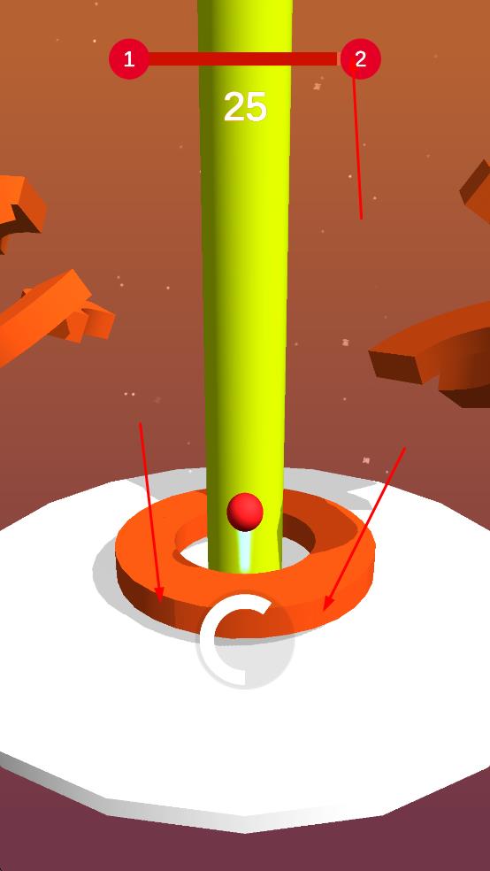 1、操控紅色小球在由不同顏色圓環(huán)組成的塔狀結構中下落,需注意圓環(huán)上的缺口,引導小球通過缺口向下移動。