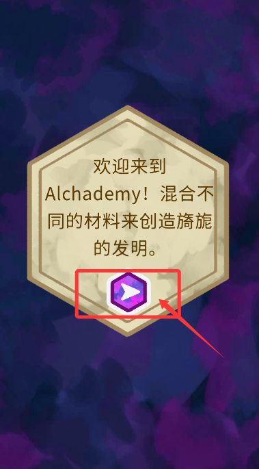 2、出現(xiàn)煉金學(xué)院歡迎界面時(shí),選擇右下角指引符號(hào),開(kāi)始材料調(diào)配實(shí)驗(yàn)。