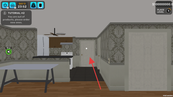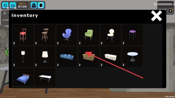 2、在游戲的主場景中,根據(jù)紅色箭頭所指的方向,在Inventory界面中,選擇合適的家具,開始進行游戲任務(wù)。