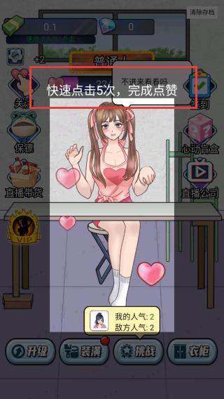 3、根據(jù)紅色箭頭所指的方向,快速點(diǎn)擊屏幕5次,完成點(diǎn)贊任務(wù),獲取游戲得分和獎(jiǎng)勵(lì),積累游戲資源,提升角色的能力。