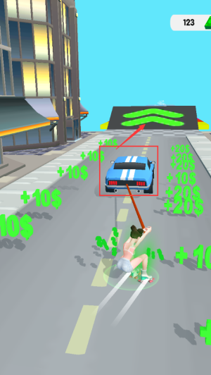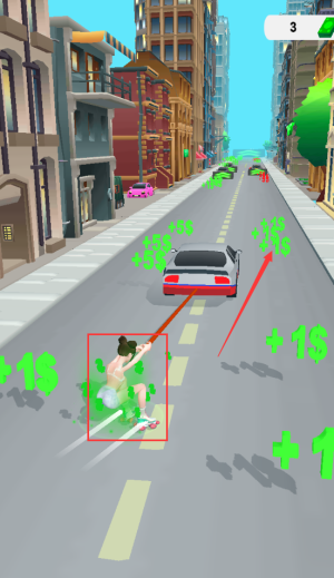 1、控制紅框滑板女孩,收集綠色金錢符號得分。