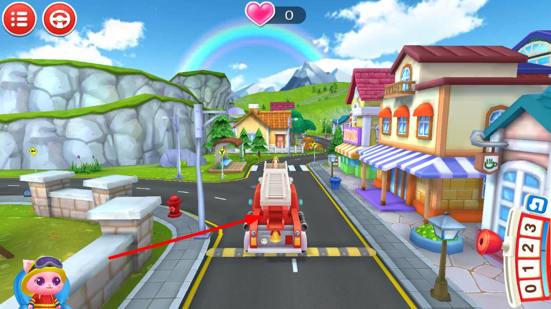 2、城市中發(fā)現(xiàn)需要幫助的小伙伴,參與九個(gè)救助小游戲,完成任務(wù)收集愛(ài)心,若走錯(cuò)路可點(diǎn)擊“藍(lán)色箭頭”調(diào)轉(zhuǎn)車頭,還能點(diǎn)擊左上角“方向盤(pán)”按鈕切換駕駛模式。