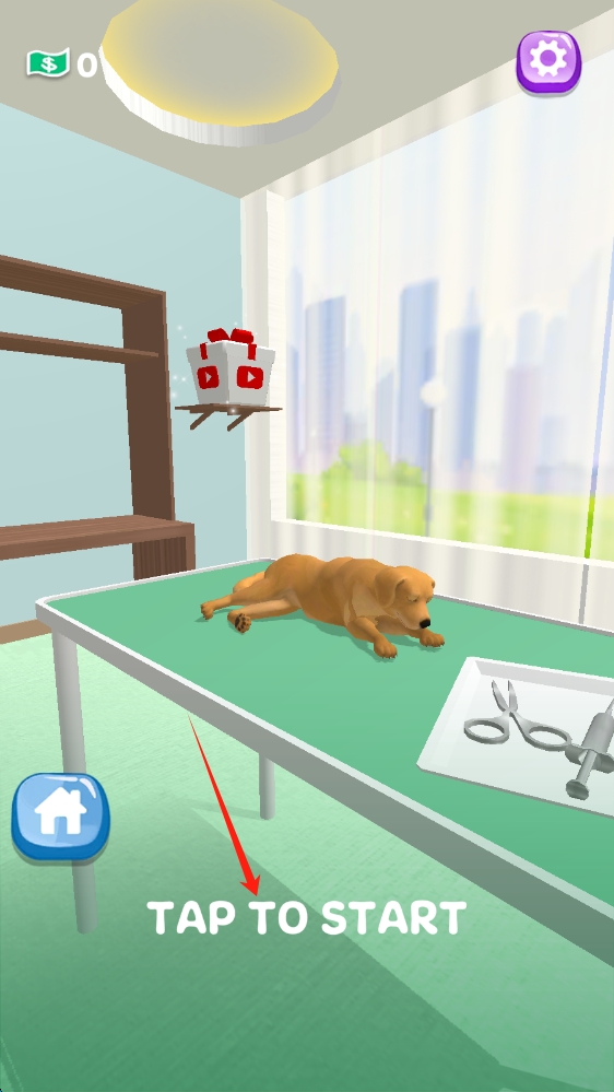1、游戲開(kāi)始時(shí),點(diǎn)擊TAPTOSTART,進(jìn)入寵物護(hù)理場(chǎng)景,點(diǎn)擊按鈕進(jìn)入到游戲當(dāng)中。