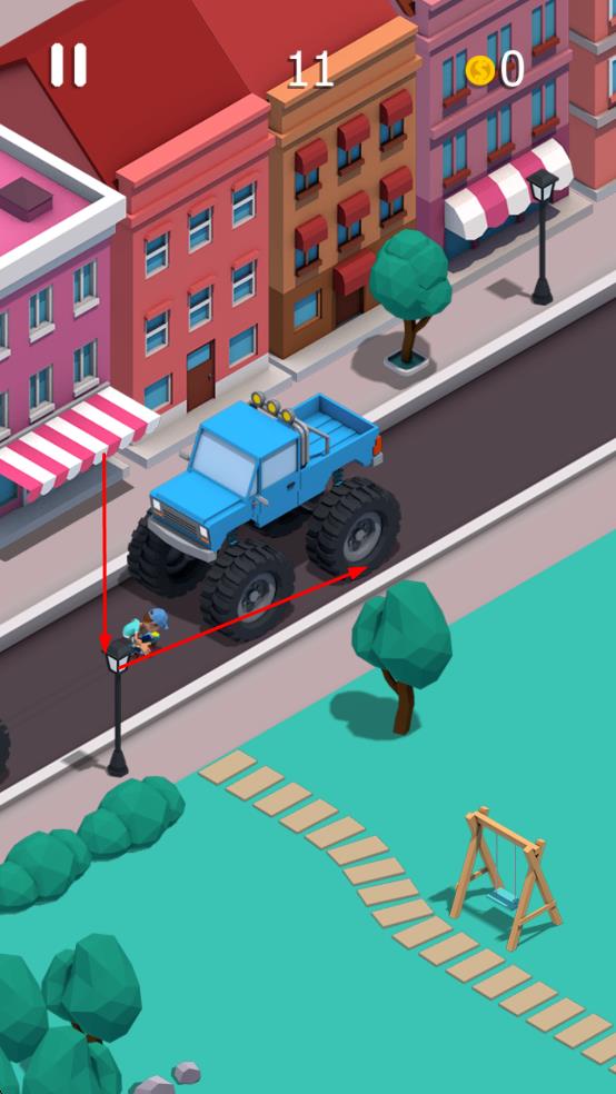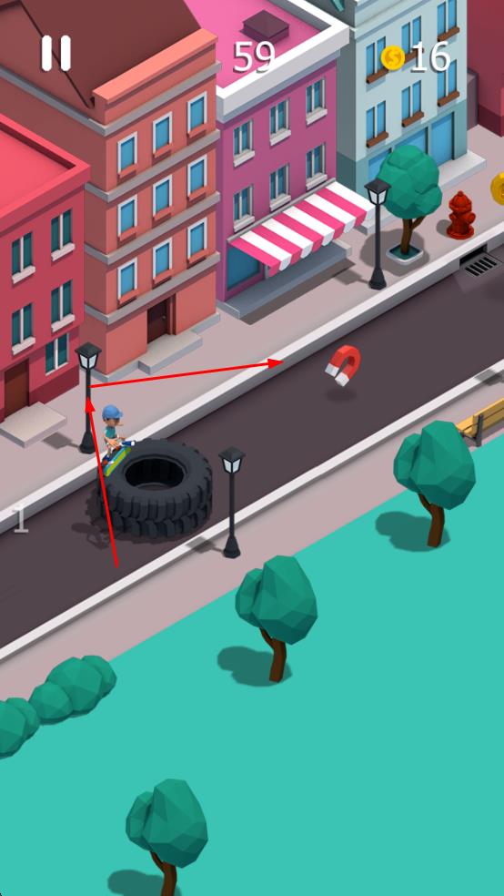 1、操控角色在城市街道場(chǎng)景中移動(dòng),角色可以是騎著滑板的小人,場(chǎng)景中有不同顏色的建筑物、樹(shù)木、路燈、秋千、長(zhǎng)椅等元素。