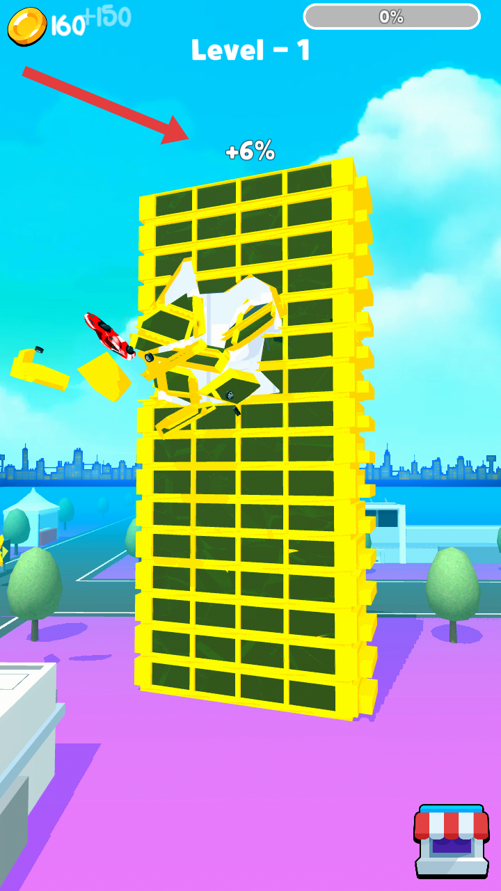 2、在車輛撞擊大樓的過程中,破壞大樓可以獲金幣,如畫面+6%所示,需要持續(xù)撞擊積累破壞進(jìn)度。