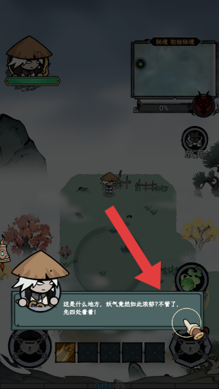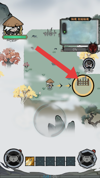 2、展示的是游戲中的初始秘境場景,根據(jù)提示點擊柵欄的區(qū)域,畫面上方顯示秘境名稱為初始秘境,還有進度顯示。