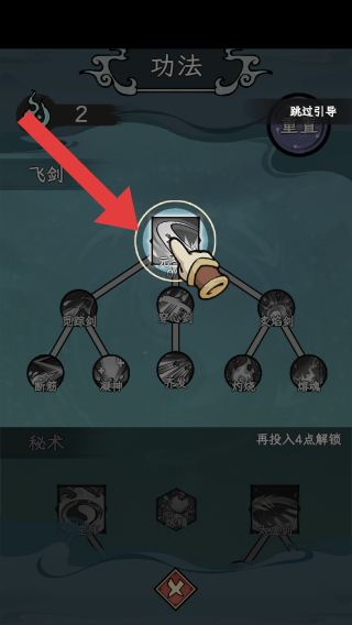 3、界面上方顯示功法的字樣,當前功法點數(shù)為2,紅色箭頭所指是飛劍功法分支,投入4點可解鎖秘術(shù),界面還有跳過引導(dǎo)按鈕。