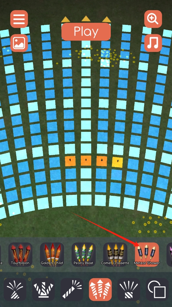 2、在煙花選擇界面,挑選喜歡的煙花類型,如Meteor-Shower,為燃放做準(zhǔn)備,點擊放置煙花。