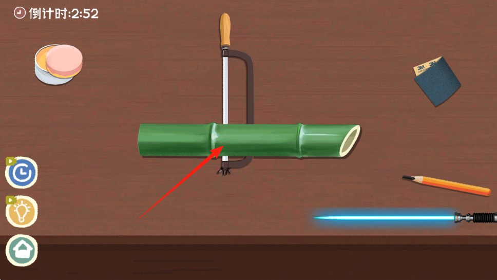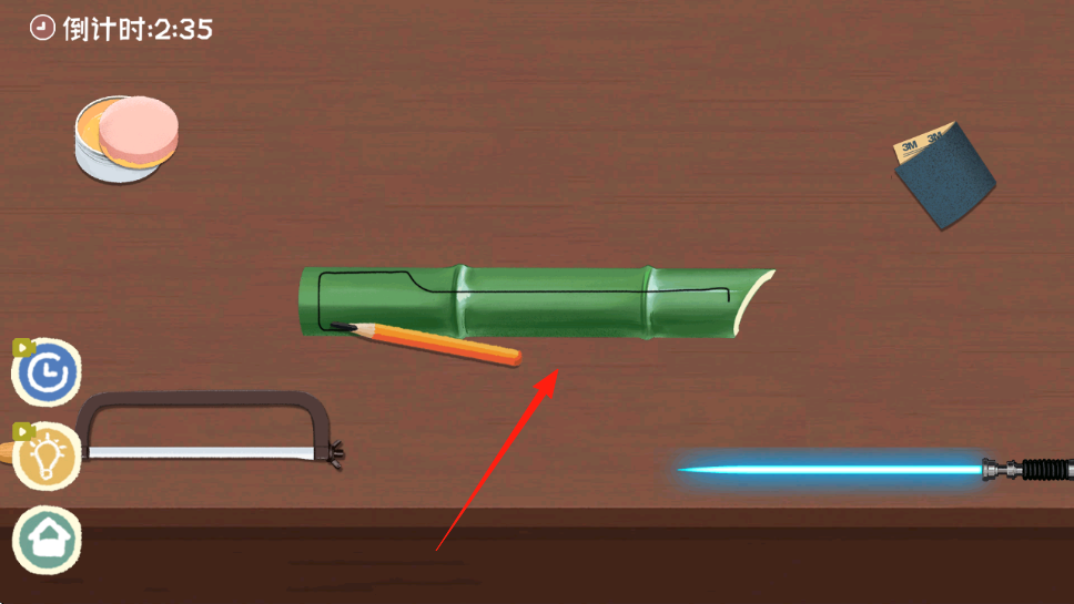3、拿起鉛筆按照紅箭頭標記的線條在竹子上畫出切割線,確保線條筆直且位置準確,這是后續(xù)切割的基礎。