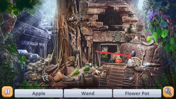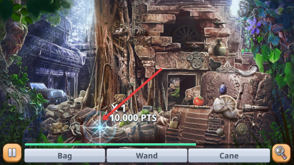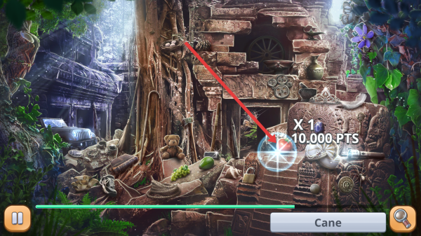 2、再次尋找遇到難尋物品,點(diǎn)右下角放大鏡提示,注意場(chǎng)景互動(dòng)如紅箭頭指引隱藏點(diǎn),連點(diǎn)加分項(xiàng)。
