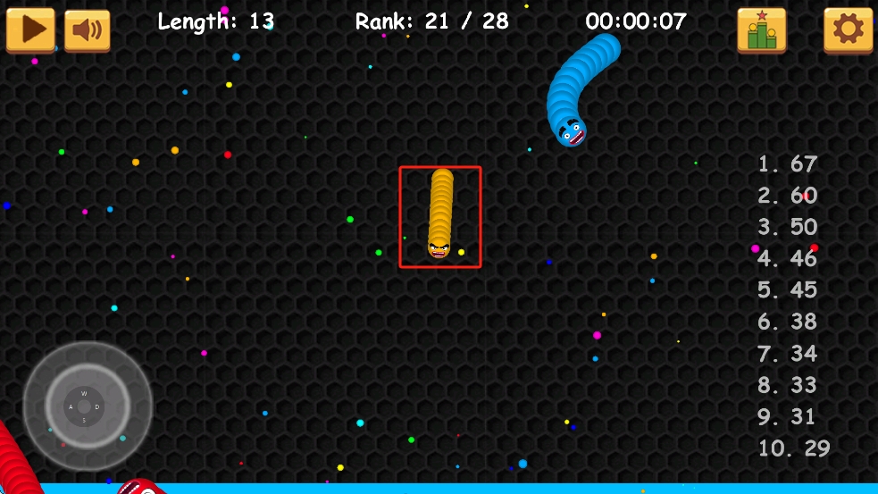 1、開局我們操控黃色小蛇,在地圖中游走,吃掉彩色光點(diǎn)增長(zhǎng)長(zhǎng)度,避開其他蛇的身體,利用靈活轉(zhuǎn)向搶占光點(diǎn)資源。