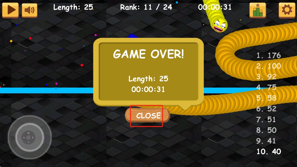 3、游戲結(jié)束后若想重新開始,點(diǎn)擊CLOSE關(guān)閉結(jié)算界面,回到主界面再次進(jìn)入游戲,嘗試突破更長(zhǎng)長(zhǎng)度。