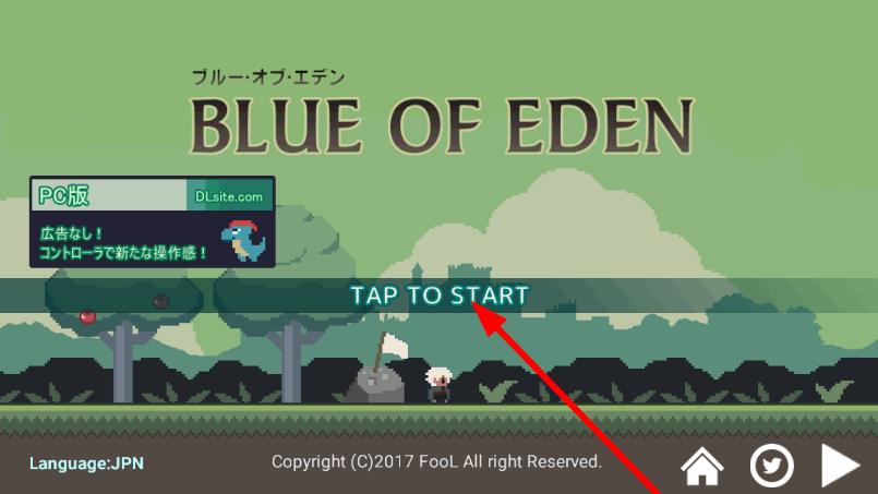 1、游戲初始界面顯示BLUE OF EDEN標(biāo)題,點(diǎn)擊TAP TO START,進(jìn)入開啟像素風(fēng)冒險(xiǎn)。