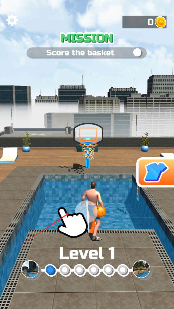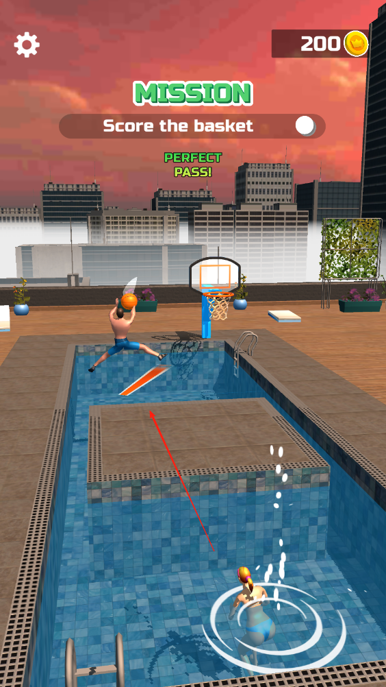 1、人物腳下有個(gè)大致方向,點(diǎn)擊屏幕后人物則會(huì)開(kāi)始投籃,要在人物落水前丟進(jìn)籃球即可。