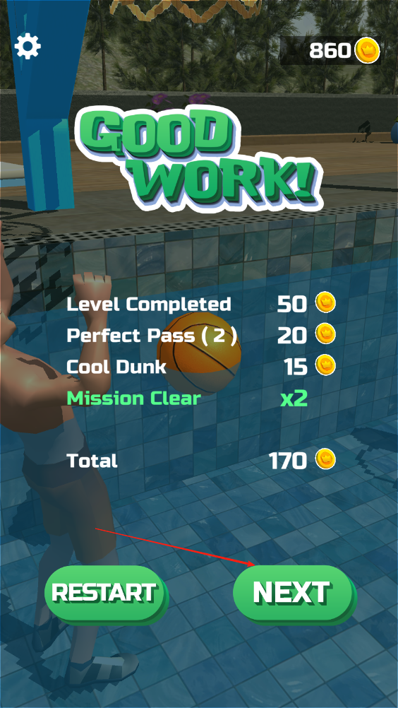 3、完成投籃任務(wù)后,會(huì)根據(jù)扣籃,傳球,以及進(jìn)球時(shí)間等進(jìn)行評(píng)分,以此獲取獎(jiǎng)勵(lì)來(lái)購(gòu)買(mǎi)籃球皮膚,泳池樣式,以及角色裝扮。