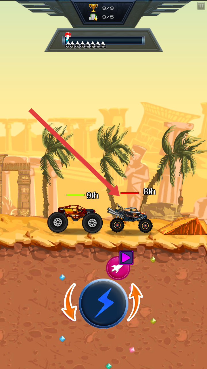 1、開局操控賽車處在賽場(chǎng)的9th,可以點(diǎn)擊底部閃電按鈕觸發(fā)加速,嘗試超越前方黑色卡車8th。