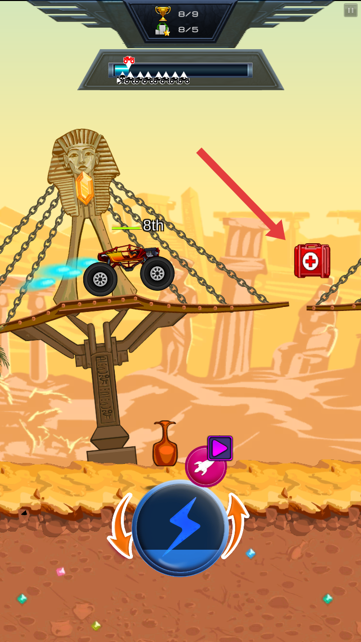 2、行駛至Sphinx雕像旁的紅色急救箱區(qū)域,優(yōu)先收集道具恢復(fù)車輛的血量,來(lái)提升自身的續(xù)航能力。