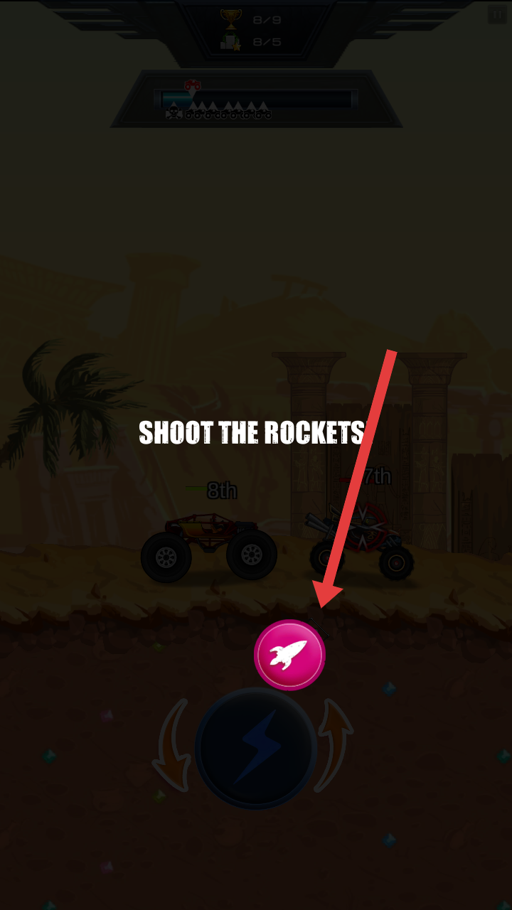 3、當(dāng)界面提示SHOOT THE ROCKETS時(shí),點(diǎn)擊粉色火箭按鈕,向?qū)κ职l(fā)射火箭,干擾它行駛。