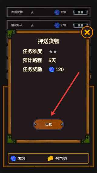 2、點擊任務詳情底部出發(fā)按鈕,消耗奶酪等資源,當前顯示467/885,派遣隊伍執(zhí)行押送貨物任務推進流程。