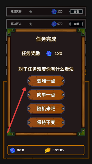 3、任務完成彈出任務完成界面,領取120藍晶獎勵后,選變難一點或其他選項,調整后續(xù)任務難度繼續(xù)冒險。