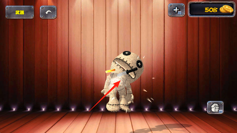 1、進(jìn)入游戲可以點(diǎn)擊武器按鈕選武器,對(duì)紅箭頭指向木偶部位攻擊,造成傷害。