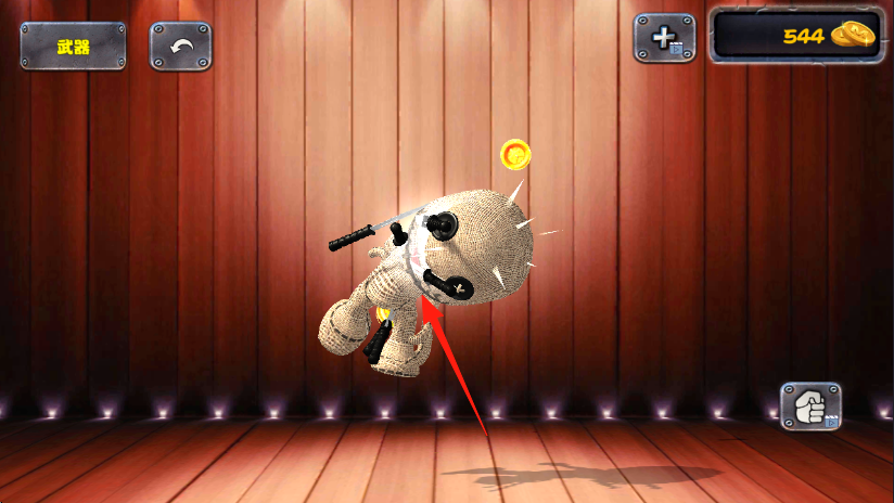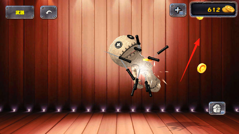 3、不斷攻擊木偶,讓武器插入其身體,按紅箭頭方向,將木偶擊飛,完成挑戰(zhàn),獲取更多金幣。