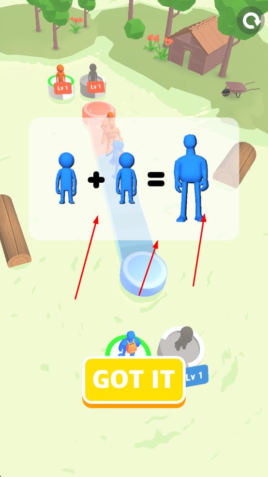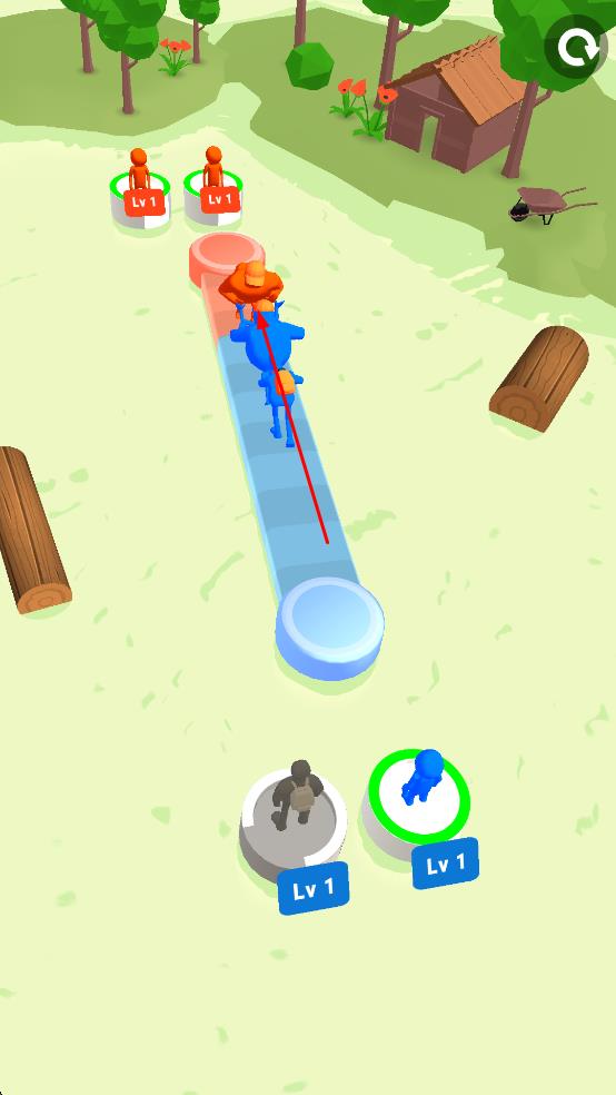 3、操控合成后的高等級(jí)角色,沿通道前進(jìn)與橙色Lv1角色對(duì)戰(zhàn),擊敗對(duì)手獲取勝利,推進(jìn)游戲進(jìn)程。