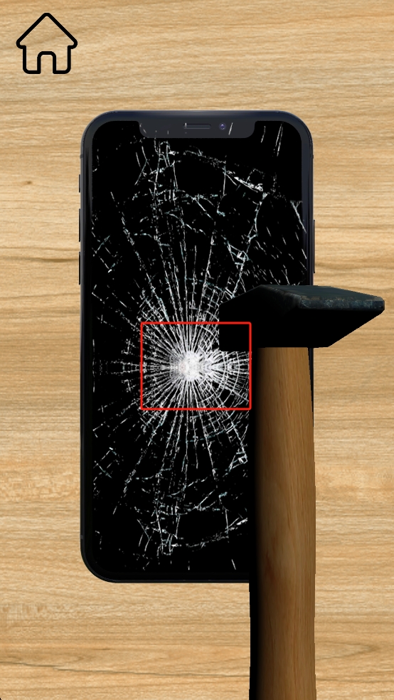 2、握住屏幕上顯示的錘子圖標(biāo),將其對(duì)準(zhǔn)手機(jī)屏幕紅色方框內(nèi)的碎裂中心點(diǎn),用力敲擊該位置,讓碎裂區(qū)域擴(kuò)大以推進(jìn)任務(wù)。