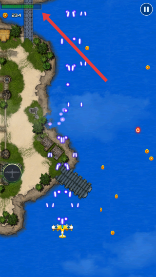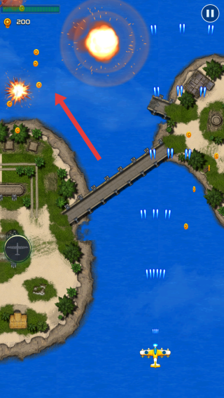 1、操控飛機(jī)在海面飛行,躲避上方爆炸和彈幕,收集沿途金幣,借助爆炸區(qū)域攻擊周邊敵人。