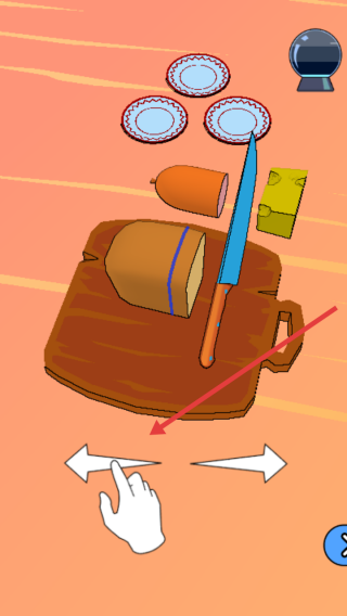 2、進入物品操作界面,按手勢指引左右滑動,用刀切割面包等食材,完成基礎(chǔ)交互任務。