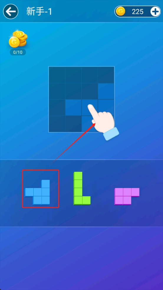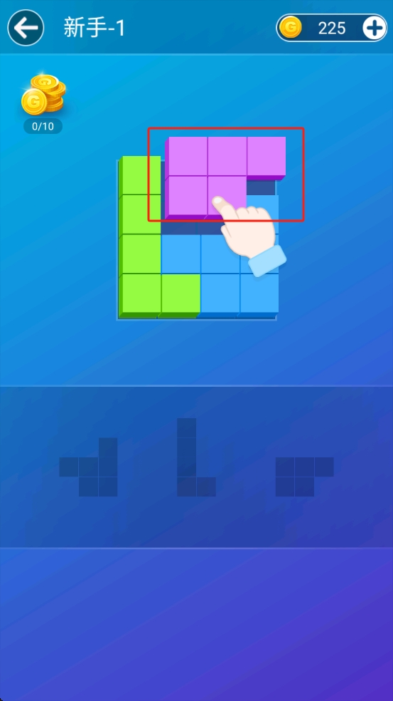 1、開局我們跟隨指引拖動(dòng)下方藍(lán)色方塊,將其放置到網(wǎng)格內(nèi)的對(duì)應(yīng)位置,開啟方塊拼接的基礎(chǔ)操作流程。