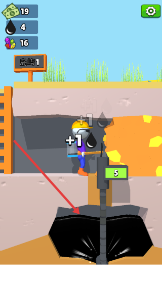3、再入礦洞,遇黑色石油區(qū)域,用升級后的挖掘設(shè)備開采石油,提升資源儲備,推進(jìn)島嶼探索。