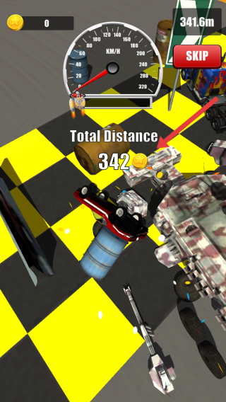 2、行駛中關(guān)注Total Distance,收集金幣,同時(shí)撞擊場(chǎng)景中的障礙物,積累行駛的距離與資源。