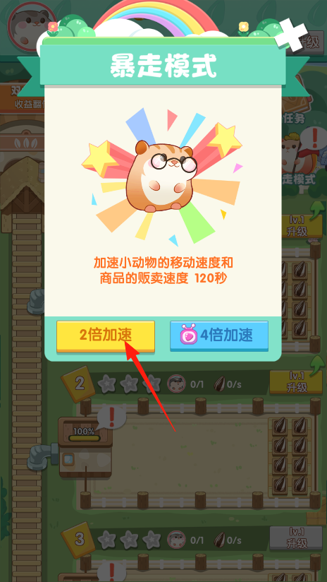 1、看到暴走模式彈窗,想讓小動物和商品速度變快,選2倍加速或4倍加速,點2倍加速,接下來120秒里,小動物跑得更歡,賣東西也更快,多賺點資源。