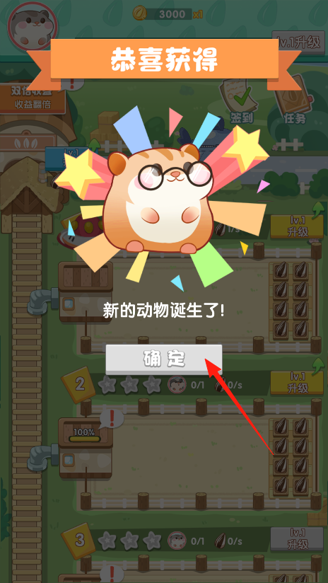2、彈出恭喜獲得提示,說明有新動物誕生啦,點確定關掉彈窗,去工廠看看新動物啥樣,安排它干活,讓新成員幫你生產賺錢。