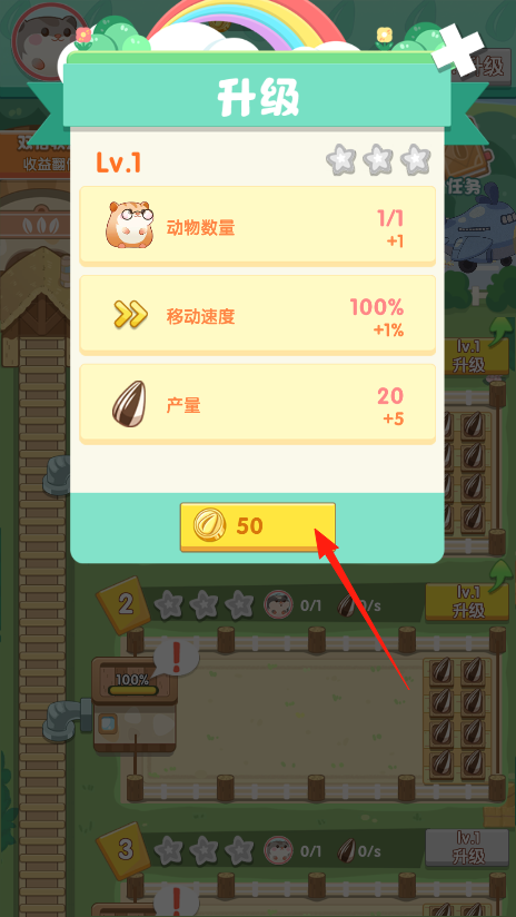 3、進入升級界面,能提升動物數量速度和產量,有50金幣就點升級按鈕,花金幣讓動物變強,數量變多跑得更快,產量更高賺更多資源。
