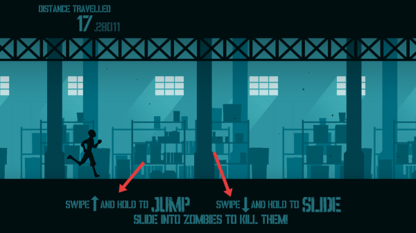 2、在奔跑過程中,通過向上滑動并按住來跳躍,躲避障礙物,向下滑動并按住來滑行,同時滑行可以殺死僵尸。